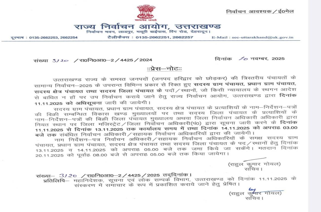 त्रिस्तरीय पंचायती उपचुनाव 20 नवंबर को