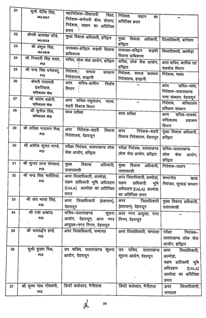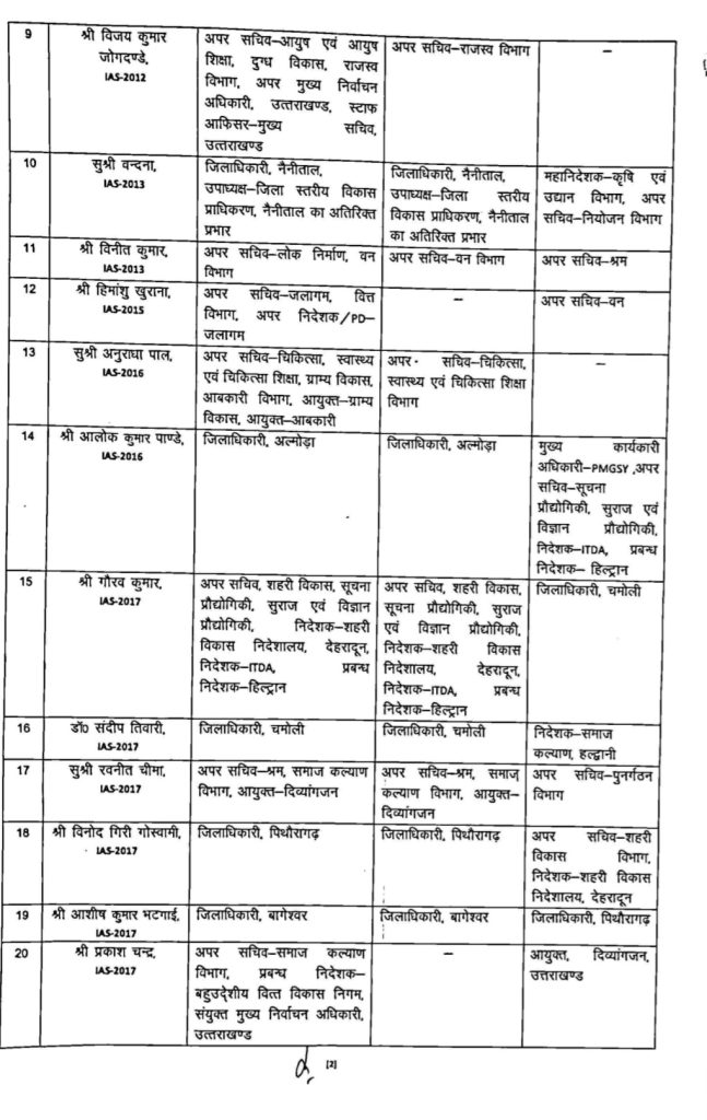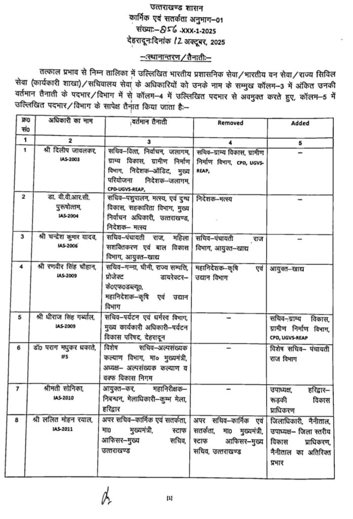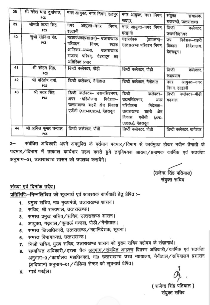 चंपावत/देहरादून। उत्तराखंड में 23 IAS, 18 PCS और 3 सचिवालयी सेवा के अधिकारियों के तबादले हुए हैं। संयुक्त सचिव राजेंद्र सिह पतियाल ने आज 12 अक्टूबर को ये स्थानांतरण आदेश जारी किया है।