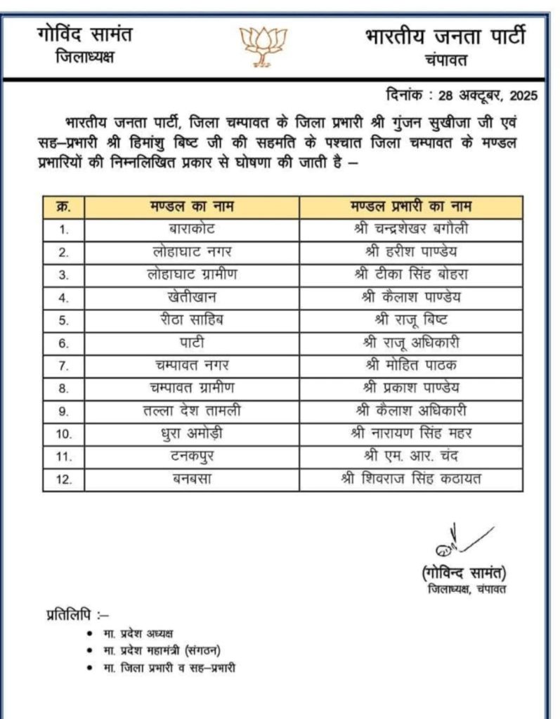 जिलाध्यक्ष सामंत द्वारा जारी सूची के मुताबिक बारकोट मंडल की जिम्मेदारी चंद्रशेखर बगौली, लोहाघाट नगर का प्रभार हरीश पांडेय, लोहाघाट ग्रामीण का टीका सिंह बोहरा, खेतीखान का कैलाश पांडेय, पाटी का राजू अधिकारी, चंपावत नगर का मोहित पाठक, चंपावत ग्रामीण का प्रकाश पांडेय, तल्लादेश तामली का कैलाश अधिकारी, धुरा अमोड़ी का नारायण सिंह महर और टनकपुर का प्रभार एमआर चंद को दिया गया है।