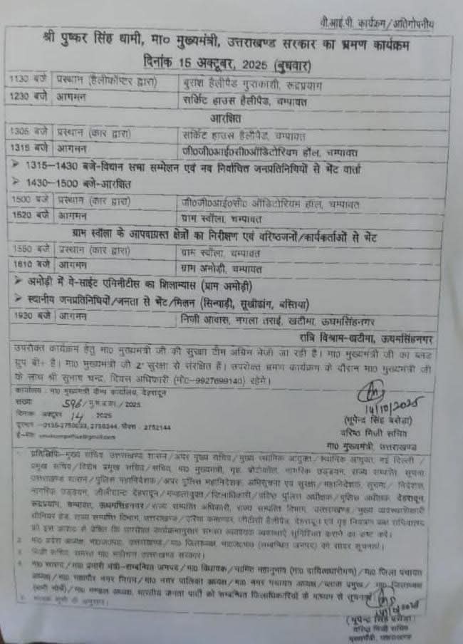 CM के वरिष्ठ निजी सचिव भूपेंद्र सिंह बसेड़ा के द्वारा जारी कार्यक्रम के मुताबिक CM धामी 15 अक्टूबर को पूर्वाह 11.30 बजे रुद्रप्रयाग जिले के गुप्तकाशी हेलीपैड से रवाना हो अपराह्न 12.30 बजे चंपावत के सर्किट हाउस हेलीपैड पर पहुंचेंगे। 1.15 बजे चंपावत GGIC ऑडिटोरियम हॉल में विधानसभा क्षेत्र के सम्मेलन और नवनिर्वाचित जनप्रतिनिधियों से भेंट करेंगे। 2.30 बजे से 3 बजे तक आरक्षित रखा गया है। CM 3 बजे कार से खटीमा रवाना होंगे। मुख्यमंत्री राष्ट्रीय राजमार्ग के आपदाग्रस्त स्थल स्वांला का निरीक्षण भी करेंगे। साथ ही कार्यकर्ताओं से भेंट और 4.10 बजे अमोड़ी में वे-साइट एमिनीटीस का शिलान्यास करेंगे। इसके अलावा CM धामी सिन्याड़ी, सूखीढांग और बस्टिया में जन प्रतिनिधियों और नागरिकों से भेंट करेंगे।