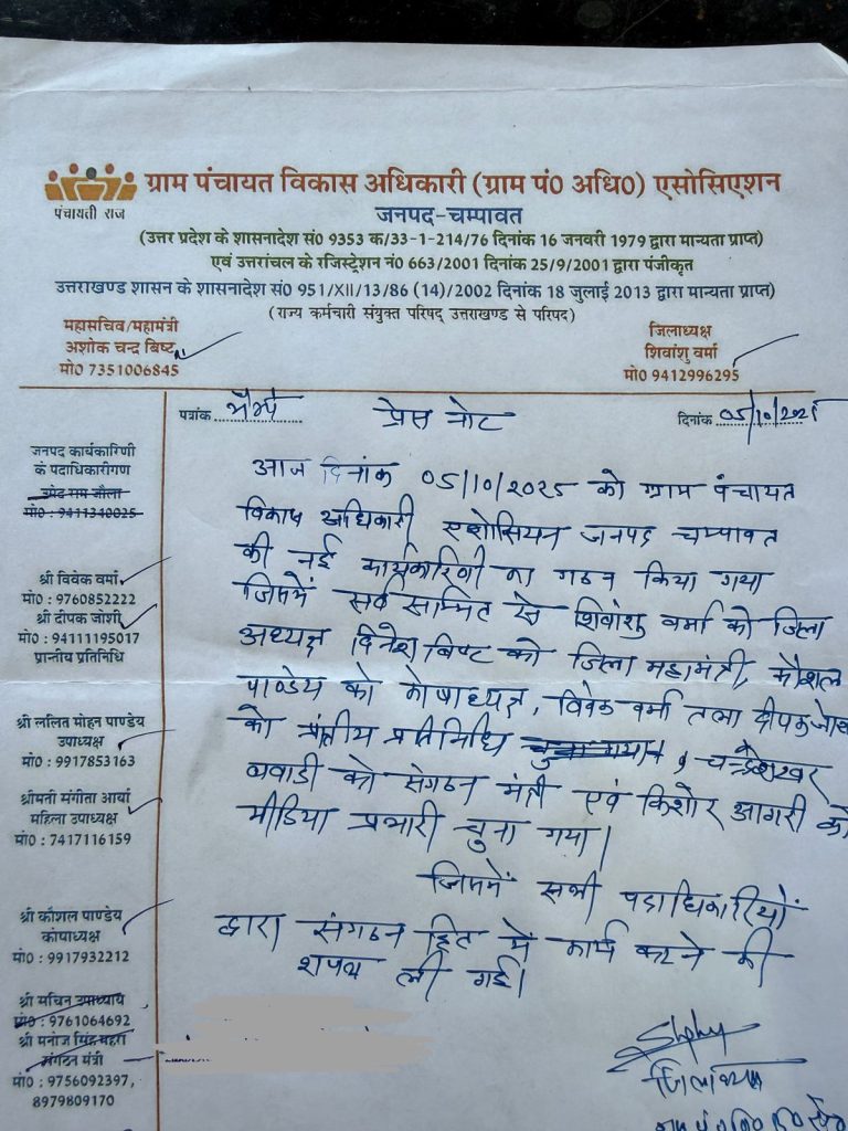 चंपावत। ग्राम पंचायत विकास अधिकारी एसोसिएशन की चंपावत जिले की नई कार्यकारिणी के चुनाव संपन्न हुए। 5 अक्टूबर को हुई चुनाव प्रक्रिया सर्वसम्मति से संपन्न हुई। शिवांशु वर्मा को जिलाध्यक्ष और दिनेश बिष्ट को जिला महामंत्री चुना गया।
