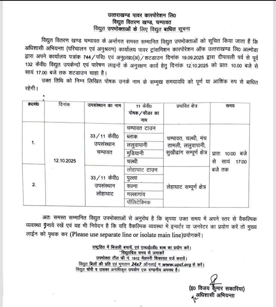 चंपावत। आज 12 अक्टूबर को चंपावत जिले के समूचे पद्धति क्षेत्र में 7 घंटे पावर कट रहेगा। UPCL के चंपावत खंड के अधिशासी अभियंता विजय कुमार साकरिया की ओर से जारी विज्ञप्ति में यह जानकारी दी गई है।
