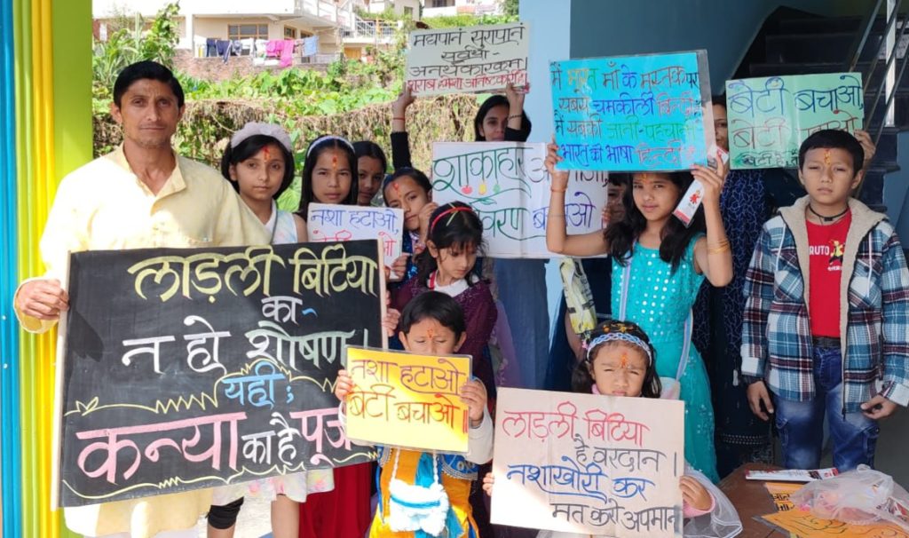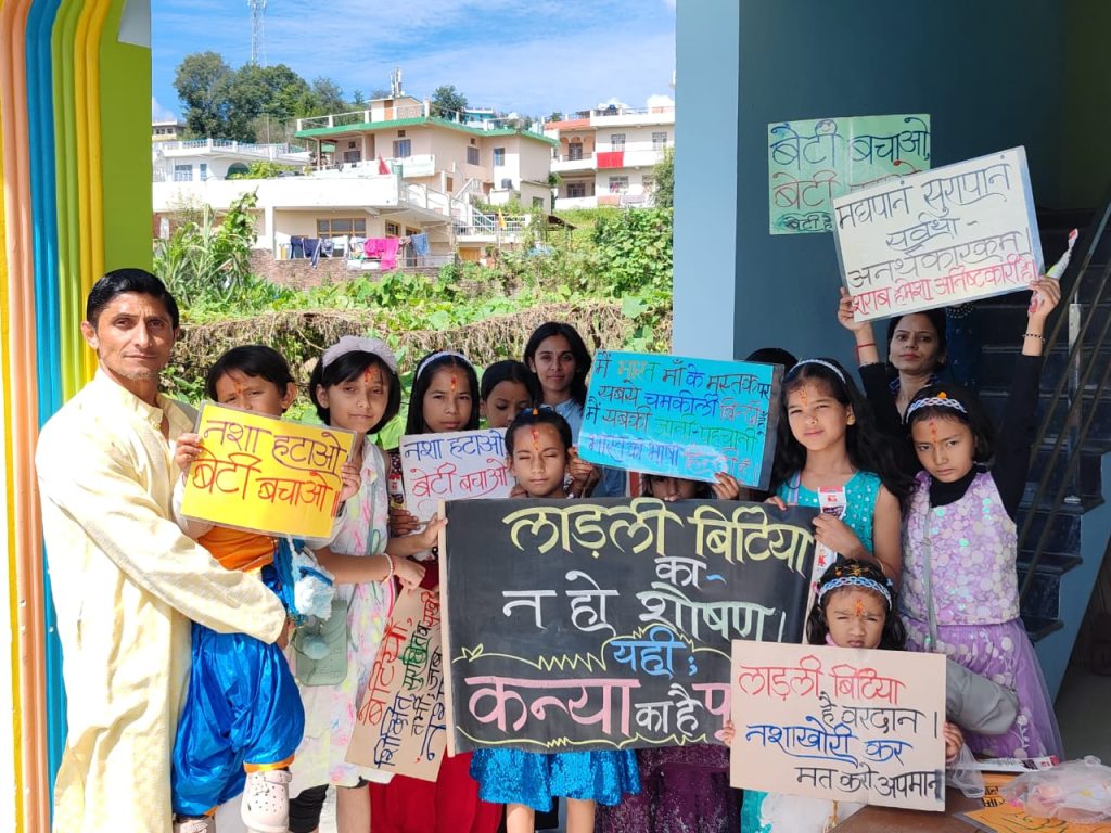 ‘लाडली बिटिया का न हो शोषण, यही कन्या का है पूजन’ विषय पर चंपावत के ज्ञानीसेरान में कन्या पूजन पर बेटियों ने स्लोगनों और पोस्टरों से नन्हीं लाडली को न्याय देने तथा बेटी को शोषण मुक्त करने का संदेश भी दिया। शिक्षक जीवन सिंह अधिकारी व विपिन अधिकारी के नेतृत्व में चले जागरूकता अभियान में शिक्षक आर्य ने कहा कि नवरात्र महानवमी पर देवी स्वरूपा कन्याओं का पूजन कर परिवार व समाज के स्वस्थ जीवन की कामना की जाती है, लेकिन आज समाज के ही कुछ निर्दयी, निष्ठुर व निर्लज्ज असामाजिक तत्व नशे के वशीभूत होकर लाडली बेटियों का शोषण कर डालते हैं। जिससे मासूम बेटियों, महिलाओं तथा उनके परिवारों में असुरक्षा को लेकर नितांत भय व्याप्त हो जाता है। यही नहीं लाडली बेटियों के प्रति इन बढ़तीं अमानवीयताओं के कारण बेटी का पारिवारिक व सामाजिक जीवन चुनौतीपूर्ण होता जा रहा है। कार्यकम में क्यारा, लक्षिता, इतिशा, भविष्या, रेणुका, सिमर, संस्कृति, गुंजन, सपना, ममता, शिक्षा, ललिता देवी, पुष्पा देवी, एकता आदि मौजूद थे।