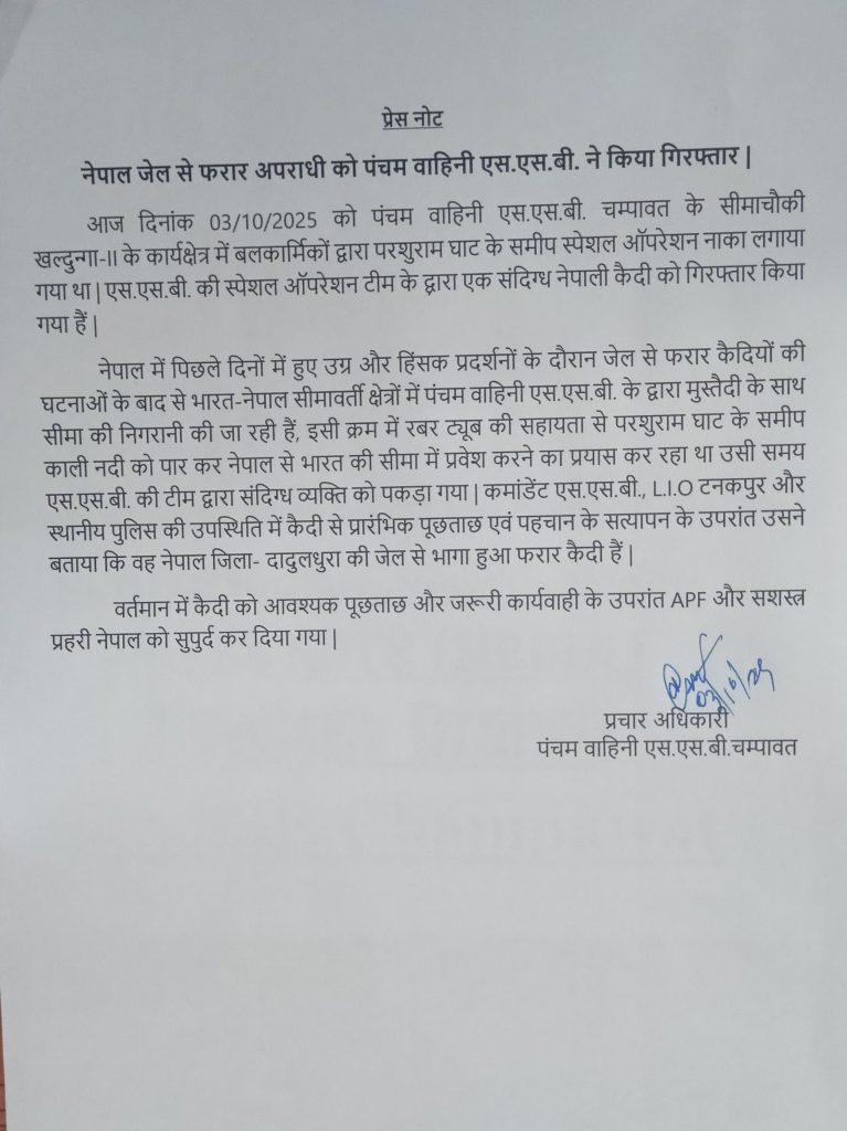 चंपावत/टनकपुर। नेपाल में 8 सितंबर में हुए जेन-जी प्रदर्शन के दौरान जेल से फरार कैदी को SSB ( सशस्त्र सीमा बल) की पंचम वाहिनी ने गिरफ्तार किया। फरार कैदी रबर ट्यूब की सहायता से परशुराम घाट के समीप काली नदी को पार कर 3 अक्टूबर को नेपाल से भारत की सीमा में घुसने का प्रयास कर रहा था। उसी दौरान SSB की टीम ने संदिग्ध व्यक्ति को पकड़ा। जरूरी पूछताछ बाद में पकड़े गए कैदी को नेपाल की APF (आमर्ड पुलिस फोर्स) के हवाले कर दिया गया। अलबत्ता सुरक्षा कर्म से पकड़े गए कैदी का नाम नहीं किया गया है।