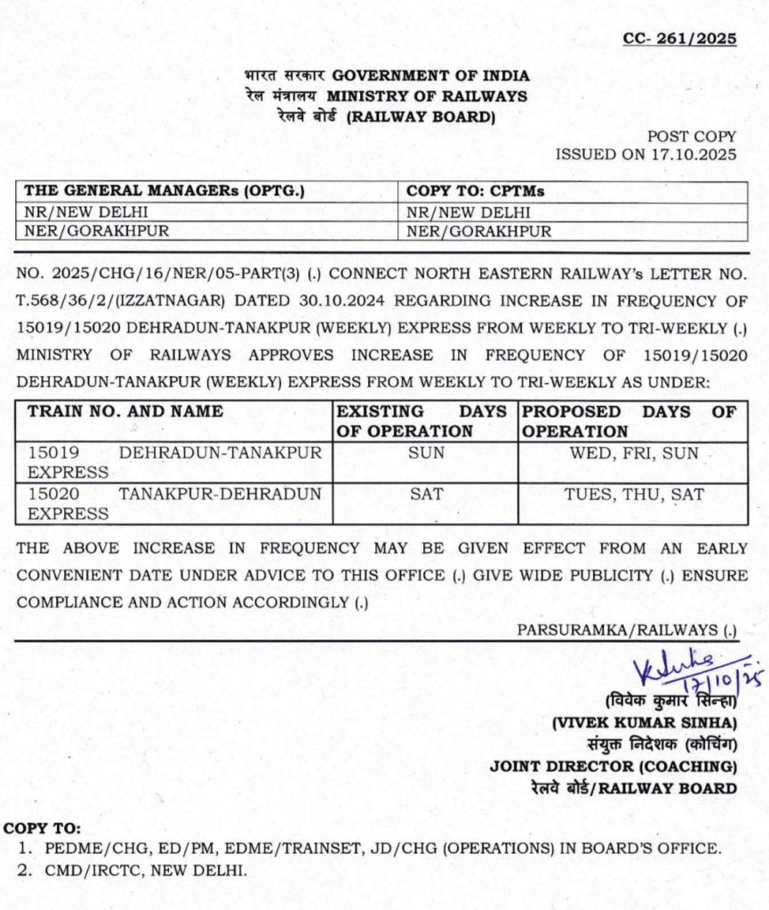 चंपावत/टनकपुर। रेल यात्रियों को दिवाली की सौगात मिल गई है। रेल विभाग ने टनकपुर-देहरादून एक्सप्रेस की सेवा को सप्ताह में एक दिन से बढ़ाकर तीन दिन करने को हरी झंडी दी है। इस संबंध में 17 अक्टूबर को रेलवे बोर्ड के संयुक्त निदेशक (कोचिंग) विवेक कुमार सिन्हा ने पत्र जारी किया है।