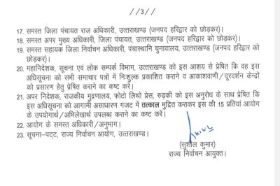 चंपावत जिले में 2286 ग्राम पंचायत सदस्यों में से 1702 पद खाली, त्रिस्तरीय पंचायती उपचुनाव 20 नवंबर को, चंपावत जिले में 312 ग्राम पंचायतों में से महज 49 ग्राम पंचायतों का ही हुआ है गठन देवभूमि टुडे चंपावत। चंपावत जिले के 1702 ग्राम पंचायत सदस्यों के उप चुनाव 20 नवंबर को होंगे। जिला निर्वाचन अधिकारी डीएम मनीष कुमार ने कल 11 नवंबर को चुनाव की अधिसूचना जारी कर दी है। त्रिस्तरीय पंचायतों के आम चुनाव के दौरान चंपावत जिले की 312 ग्राम पंचायतों के 2286 ग्राम पंचायत सदस्यों में से सिर्फ 584 सदस्यों के ही पद भरे जा सके थे। 1702 पदों के लिए कोई नामांकन नहीं हुए थे। अब उत्तराखंड के 12 जिलों (हरिद्वार को छोड़कर) के उप चुनाव के साथ चंपावत जिले के इन सभी पदों के लिए उप चुनाव होंगे।