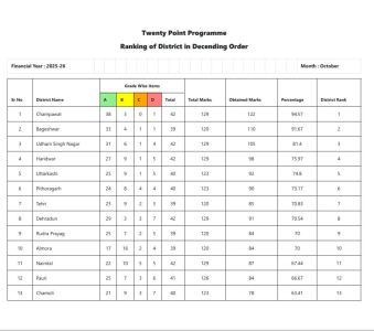 चंपावत। बीसूका (बीस सूत्रीय कार्यक्रम) में चंपावत जिले ने लगातर चौथे महीने अपने शीर्ष क्रम को बरकरार रखा है। जुलाई से लगातार चौथे माह अक्टूबर में भी चंपावत ने उत्तराखंड में पहला स्थान बरकरार रखा है। जिला अर्थ एवं संख्याधिकारी दीप्तकीर्ति तिवारी ने बताया कि