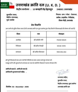उत्तराखंड क्रांति दल के युवा प्रकोष्ठ का जिलाध्यक्ष बने अमित बिनवाल