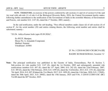 चंपावत/दिल्ली। सेवानिवृत्त IFS अधिकारी और मणिपुर वन विभाग के मुखिया रहे HoF (हेड ऑफ फॉरेस्ट) डॉ. आदित्य कुमार जोशी को राष्ट्रीय जैव विविधता प्राधिकरण का सदस्य बनाया गया है। डॉ. जोशी मूल रूप से चंपावत जिले के लटोली गांव के निवासी हैं।