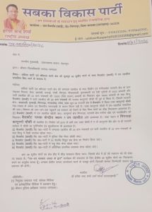 सबका विकास पार्टी के राष्ट्रीय अध्यक्ष ने CM को भेजा ज्ञापन