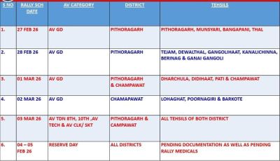 4 मार्च व 5 मार्च: रिजर्व डे। पिथौरागढ़ व चंपावत जिले के अभ्यर्थियों के लिए पेंडिंग दस्तावेज व पेंडिंग रैली मेडिकल के लिए।