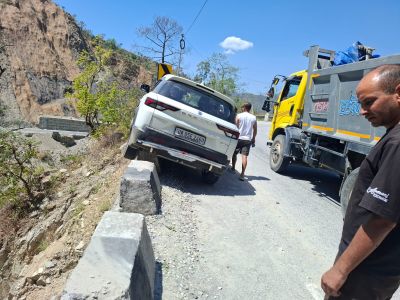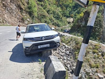 चंपावत। कार से 1 पैराफिट जमींदोज, दूसरे पर रगड़ लगी और तीसरे पैराफिट पर कार के बाई तरफ के दो टायर चढ़ गए। ये किसी फिल्म की शूटिंग नहीं है, बल्कि टनकपुर-पिथौरागढ़ राष्ट्रीय राजमार्ग पर चंपावत से 14 किलोमीटर दूर धौन के पास 15 अप्रैल अपरान्ह करीब 1 बजे हुई घटना का एक वाकया है। बस शुक्र है कि कोई बड़ा नुकसान नहीं हुआ।