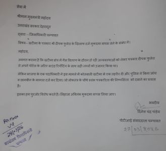 चंपावत। चंपावत के पीटीआई (प्रेस ट्रस्ट ऑफ इंडिया) के संवाददाता दिनेश चंद्र पांडेय ने डीएम को ज्ञापन भेज पत्रकार फुलेरा के खिलाफ दर्ज मुकदमा वापस लेने की मांग की। कहा कि भाजपा के एक नेता की तहरीर पर बिना जांच और छानबीन के पुलिस ने मामला दर्ज किया है। जो चौथे स्तंभ को कुचलने का प्रयास है।