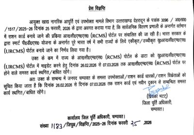जिला पूर्ति अधिकारी प्रियंका भट्ट द्वारा जारी विज्ञप्ति में कहा गया है कि राज्य के RCMS पोर्टल के डाटा को URCMS पोर्टल में माइग्रेट करने के लिए 26 फरवरी से 7 मार्च तक RCMS पोर्टल पर होने वाले सभी कार्य स्थगित रहेंगे।
