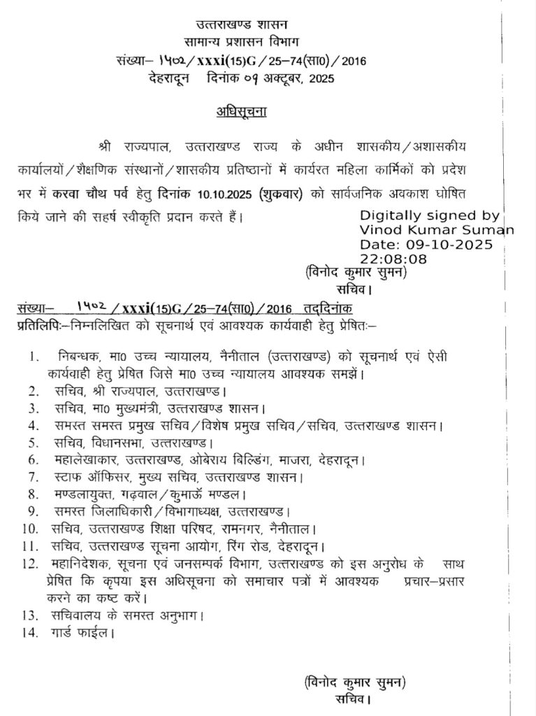 उत्तराखंड शासन ने करवा चौथ के मद्देनजर जारी किया छुट्टी का आदेश