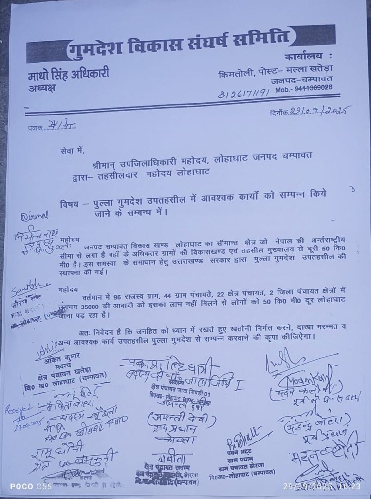करीब 3 साल पूर्व खुली गुमदेश उप तहसील से लोहाघाट क्षेत्र की 44 ग्राम पंचायतों के 96 राजस्व गांवों की 35 हजार की आबादी सीधे तौर पर लाभांवित हो रही थी। लेकिन पिछले 2 माह से कार्य संचालन बाधित है। गुमदेश विकास संघर्ष समिति के अध्यक्ष माधो सिंह अधिकारी ने बताया कि बीते 2 माह से उप तहसील में 2 गार्ड के अलावा कोई अन्य कर्मी नहीं है। कर्मचारियों की कमी से उप तहसील में खतौनी निर्गत होने का काम भी नहीं हो पा रहा है। इसके लिए ग्रामीणों को लोहाघाट तहसील की दौड़ लगानी पड़ रही है। ज्ञापन में गुमदेश विकास संघर्ष समिति के अध्यक्ष माधो सिंह अधिकारी, BDC सदस्य निर्मल नाथ, अंकित कुमार, रामू धौनी, प्रकाश सिंह धामी, बबीता, ग्राम प्रधान जयंती देवी, पवन भट्ट आदि के हस्ताक्षर हैं।